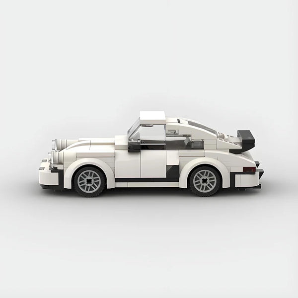 Vue de profil (côté droit) de la voiture Porsche 911 en briques blanches.