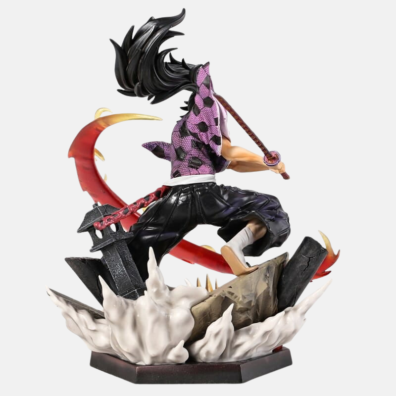 Design "Formes Lunaires" : La sculpture est une scène de combat à elle seule. Kokushibo est au centre d'un cyclone de lunes croissantes, sculptées dans un matériau translucide violet et jaune qui semble danser autour de lui. Ses six yeux sont fixés sur sa cible, et sa posture témoigne d'une maîtrise et d'une puissance absolues, forgées par des siècles d'entraînement.