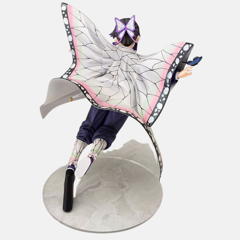 Design "Chō no mai: Tawamure" : La sculpture fige Shinobu en plein vol, ses membres positionnés avec la grâce d'une danseuse. Son haori emblématique est entièrement déployé, imitant à la perfection des ailes de papillon en plein battement. Sa lame de Nichirin, fine comme un dard, est prête à frapper, tandis que son sourire serein ne quitte jamais son visage.