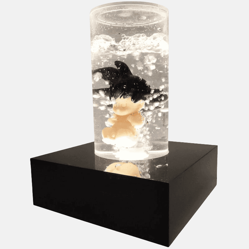 Figurine de Baby Goku (Kakarot) dans sa capsule d'oxygène (incubateur) de Dragon Ball Z, illuminée par une LED blanche, vue de face.