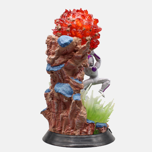 "L'Explosion de Namek" Le diorama dynamique de 28 cm le montre en pleine action, déclenchant une explosion (Blast) depuis son siège. L'effet d'énergie verdâtre et les rochers éclatés au sol rappellent ses méfaits sur Namek.