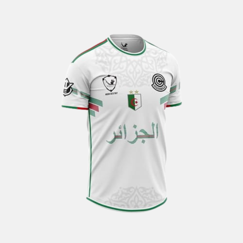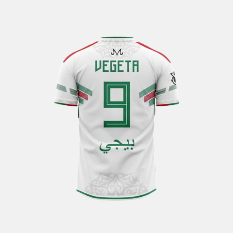 Design "Fennec Saiyan" : Ce design exclusif reprend les couleurs emblématiques du maillot de l'Algérie, rehaussé par le nom "VEGETA" et son numéro floqués dans le dos. Le logo sur le torse est finement brodé, créant un maillot conceptuel que tout fan rêverait de voir en vrai.