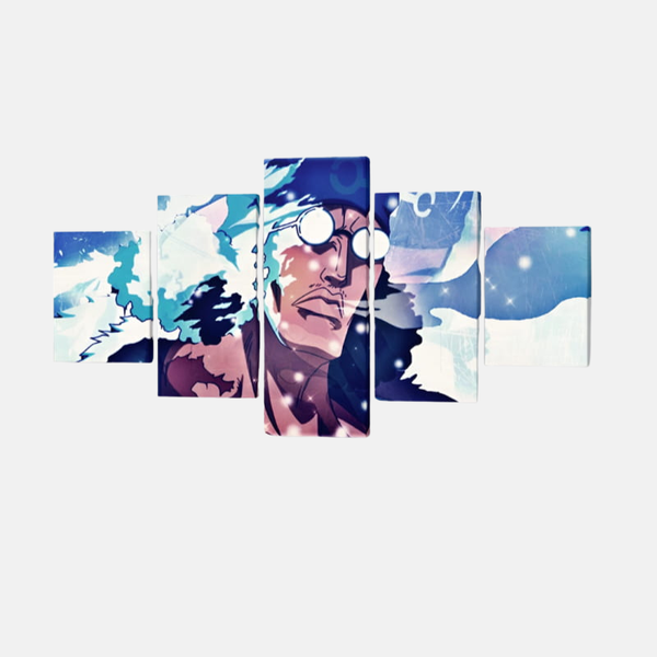 Design "Ice Age" : L'œuvre est une composition d'une froideur saisissante. Kuzan, dans sa tenue de voyageur post-ellipse, est représenté utilisant son pouvoir du Hie Hie no Mi. La glace se propage à travers les 5 panneaux, créant un effet cristallin et fracturé qui donne l'impression que votre mur est en train de geler.