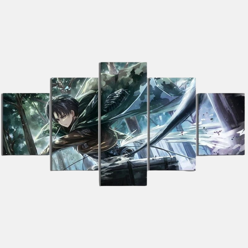 Design "Tourbillon d'Acier" : L'œuvre est une démonstration de vitesse et de précision. Livaï est figé dans une posture de combat aérienne, ses lames prêtes à trancher la nuque d'un titan. La composition en 5 panneaux décompose son mouvement, accentuant la complexité et la fluidité de ses attaques avec l'équipement tridimensionnel.
