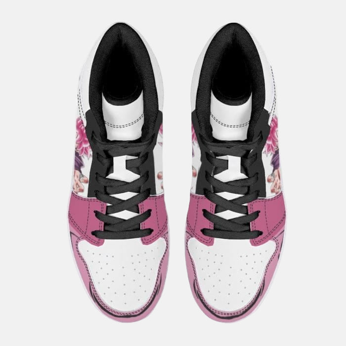 Design "Super Saiyan Rosé" : Adoptant une silhouette montante classique, ces baskets sont un hommage à la puissance divine de Zamasu. Le design arbore une palette de couleurs rose, noir et gris, rappelant l'aura du Super Saiyan Rosé, avec une illustration du personnage prêt à exécuter son plan "Zéro Humain".