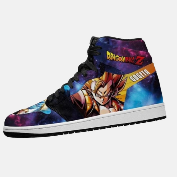 Paire de baskets montantes inspirées de Gogeta, montrant le design cosmique du guerrier fusionné.
