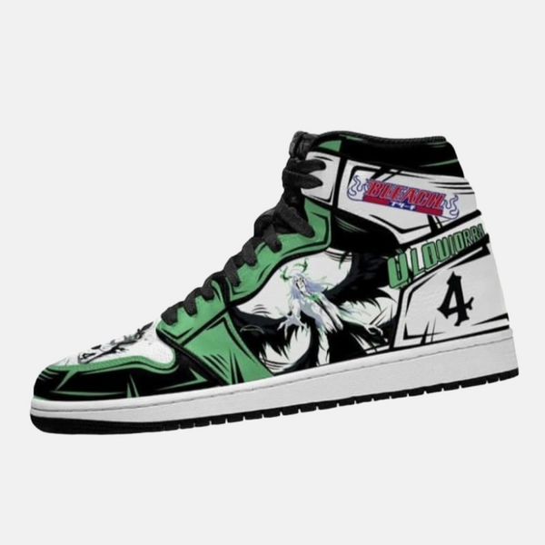 Design "11ème Division" : Adoptant une silhouette montante, ces baskets sont un hommage à l'esthétique sauvage de Kenpachi. Le design arbore une palette de couleurs sombres et des motifs qui rappellent son cache-œil et son haori en lambeaux, avec une illustration du Capitaine au sourire carnassier.