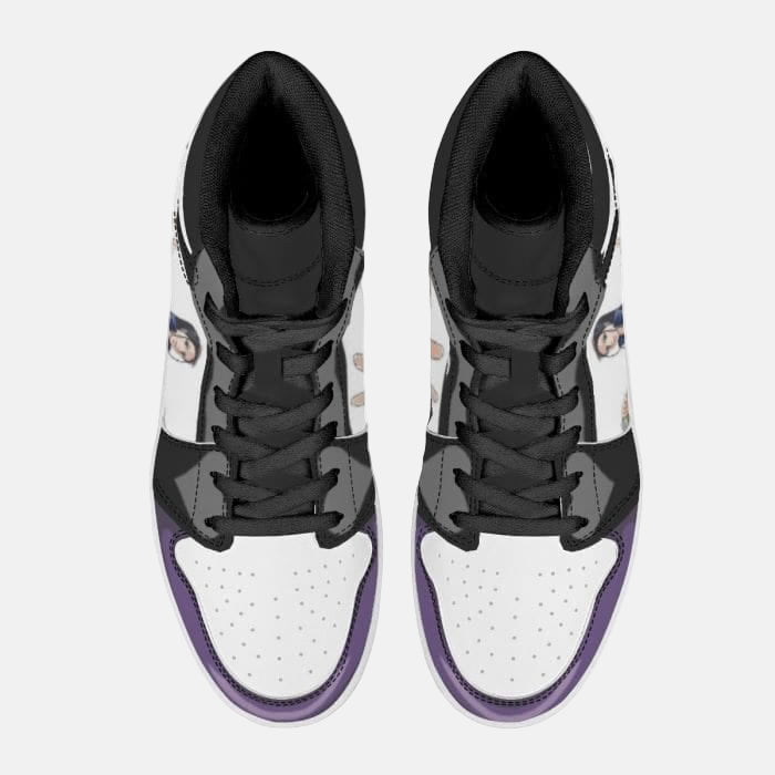 Paire de baskets montantes inspirées de Nico Robin, montrant le design violet et noir de sa forme "Demonio Fleur".