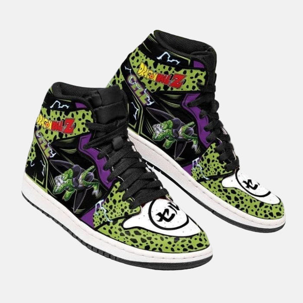 Paire de baskets montantes inspirées de Perfect Cell, montrant le design vert et noir de l'androïde de Dragon Ball Z.