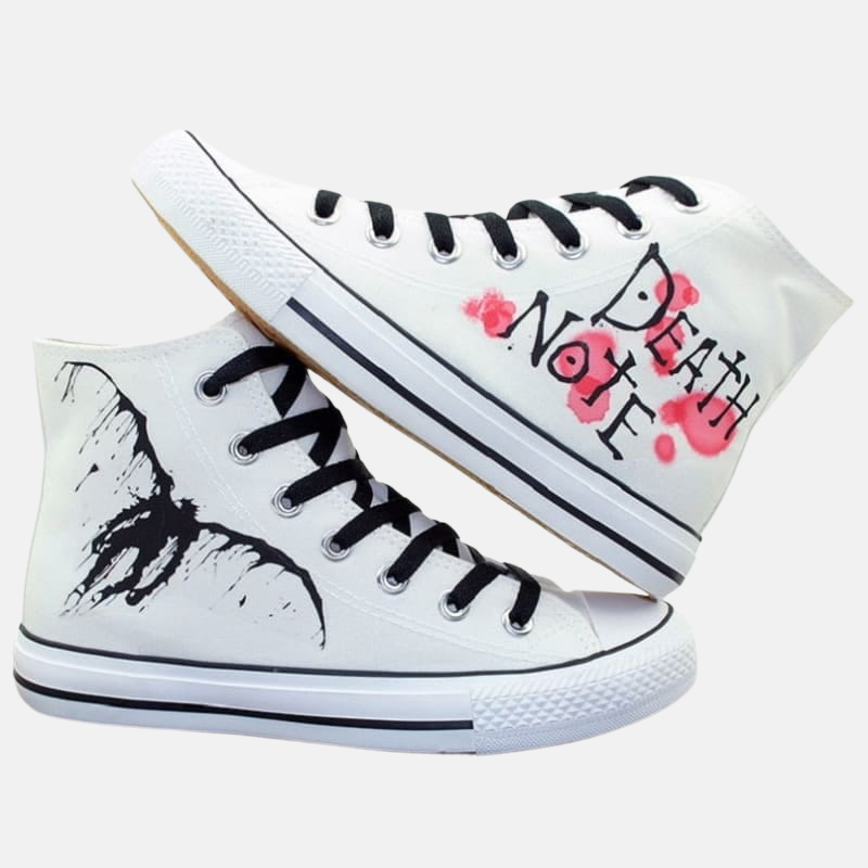 Design "Dieu de la Mort" : Adoptant une silhouette montante classique de type "Converse", ces baskets arborent une base blanche contrastée par des détails noirs et rouges. L'artwork stylisé représente Ryuk dans toute sa splendeur gothique, créant un look punk-rock et audacieux.