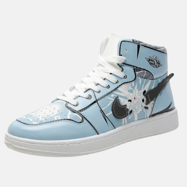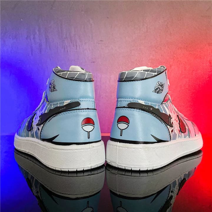 Paire de baskets montantes inspirées de Sasuke Uchiwa et de sa technique Kirin, montrant le design bleu clair.