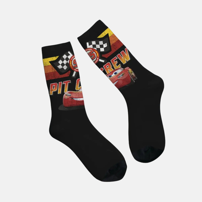 Lore "L'Esprit d'Équipe" : Ces chaussettes célèbrent le travail d'équipe. Elles rappellent l'importance de Guido, Luigi, Fillmore et Sarge, ceux qui travaillent dans l'ombre pour que le champion puisse briller. C'est un hommage à la confiance et à la coordination parfaites.