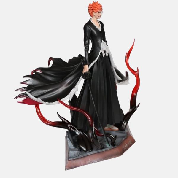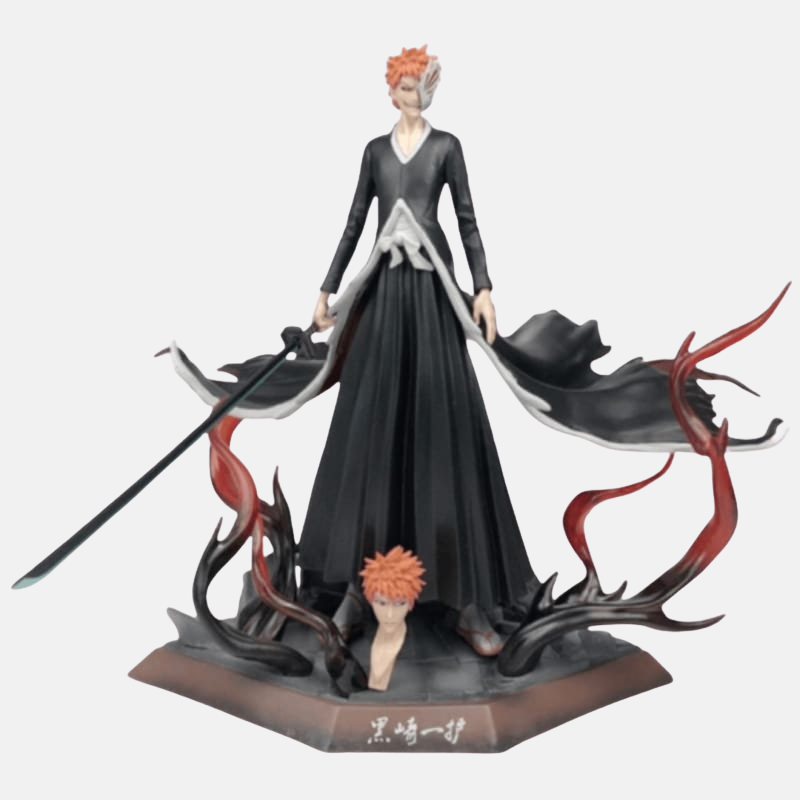 • Design "Bankai Masqué" : La sculpture représente Ichigo dans sa forme Bankai, Tensa Zangetsu en main, prêt à lancer un Getsuga Tenshō. La moitié de son visage est recouverte par son masque de Hollow iconique, ses yeux brillant d'une lueur dorée et prédatrice. Sa posture agressive, penchée en avant, capture sa vitesse et sa puissance de frappe phénoménales.