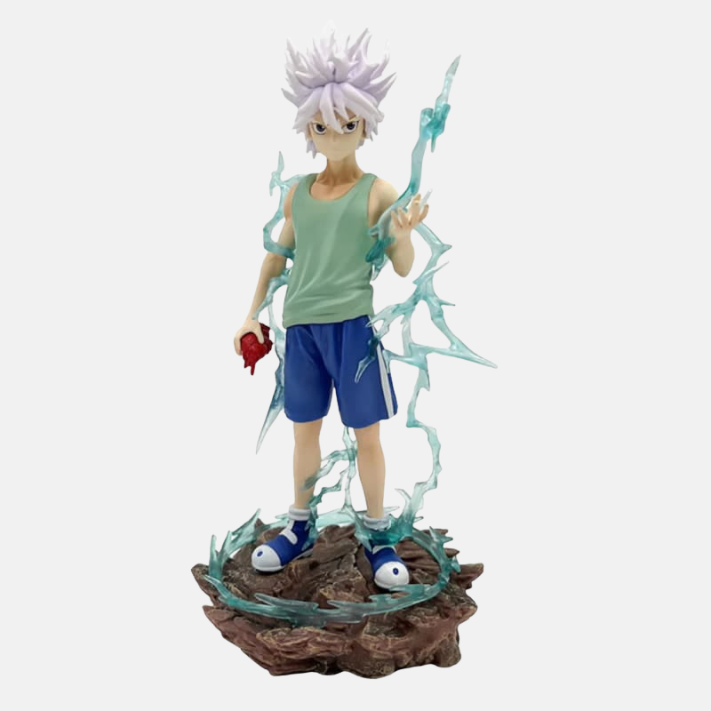 Design "Aura Électrique" : La sculpture est une œuvre d'art dynamique. Kirua se tient fièrement sur un diorama rocheux, son corps entier crépitant d'éclairs bleus translucides. Son expression est celle d'une concentration totale, d'un maître en plein contrôle de son pouvoir. La composition verticale donne une impression de puissance ascendante.