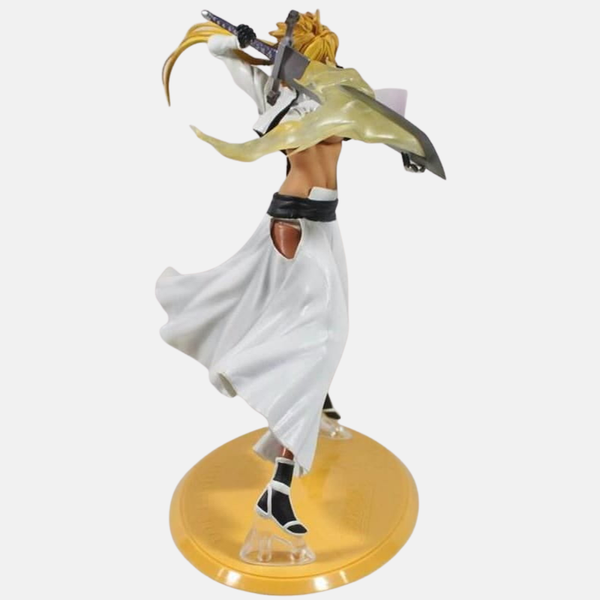 Finition "Reiatsu Doré" : Fabriquée en PVC de haute qualité, cette figurine bénéficie d'une sculpture qui met en valeur sa silhouette puissante et les détails de sa tenue complexe. La peinture est appliquée avec soin pour retranscrire sa carnation, ses cheveux blonds et les couleurs vives de son arme.