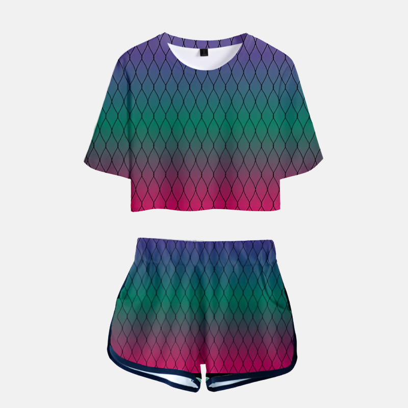 Un Style Dangereusement Séduisant Ce n'est pas parce qu'on est une Lune Supérieure qu'on ne peut pas avoir de style, même au repos ! La coupe tendance du crop top et du short, alliée au motif iconique, en font un ensemble parfait pour les fans qui veulent allier passion et mode.