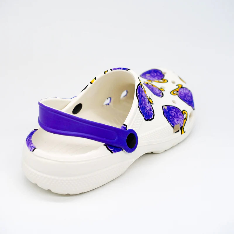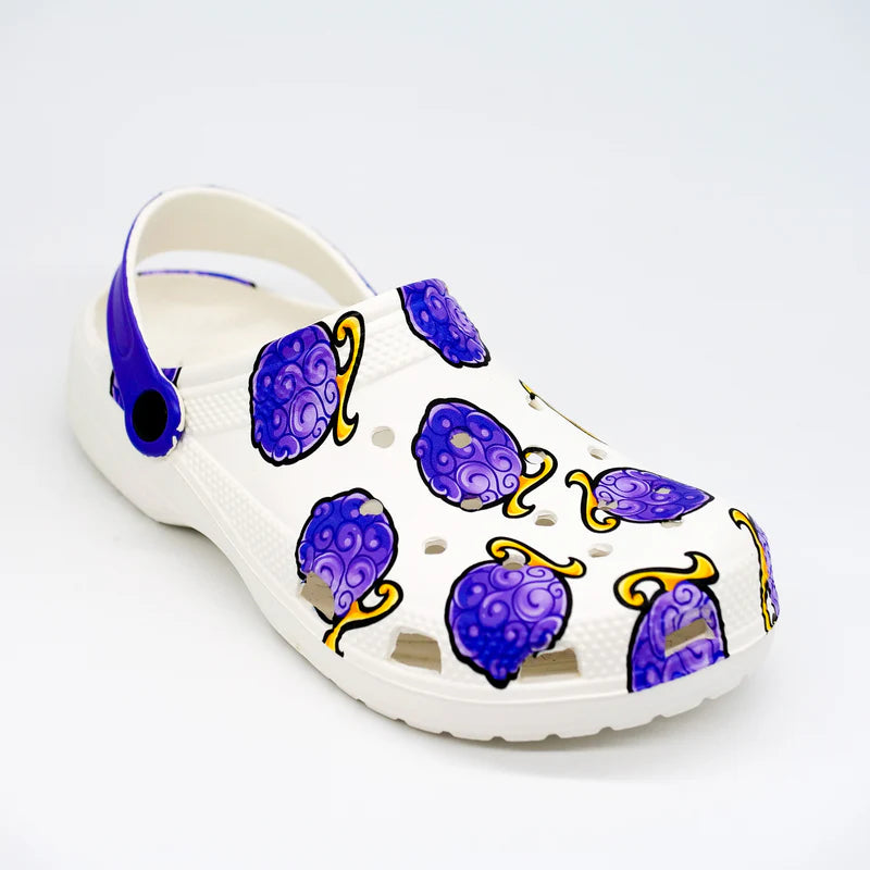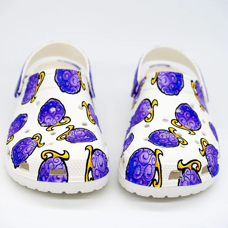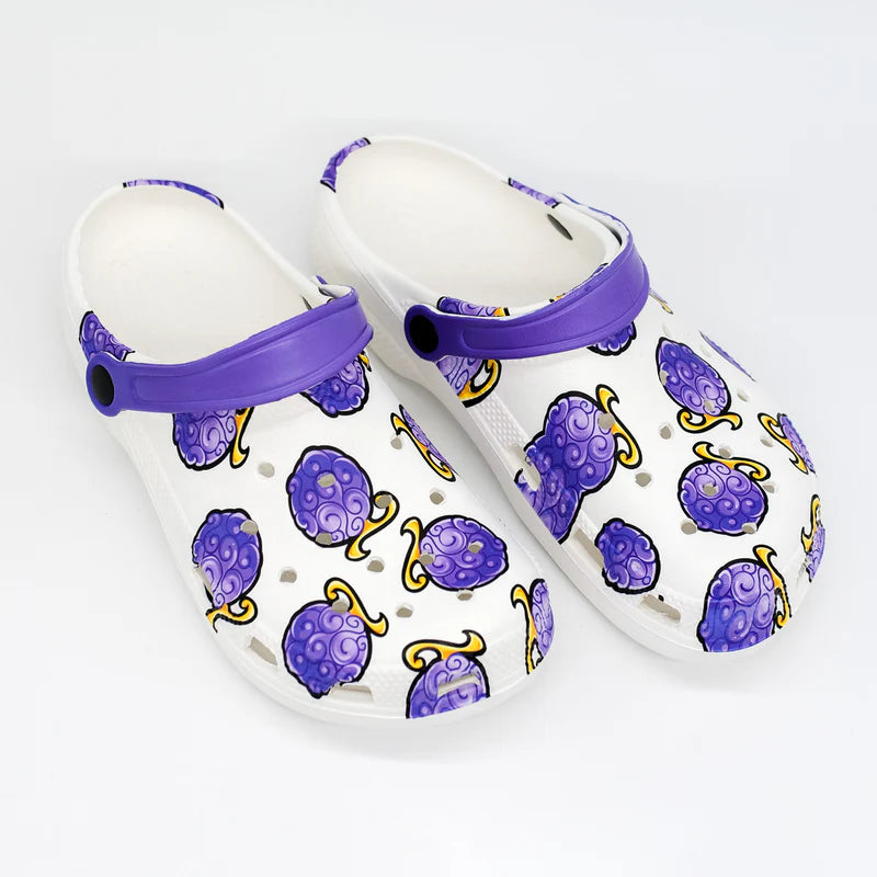 Ces sabots sont inspirés du célèbre Fruit du Démon de Luffy, avec un motif violet vibrant sur fond blanc et une bride violette contrastante.