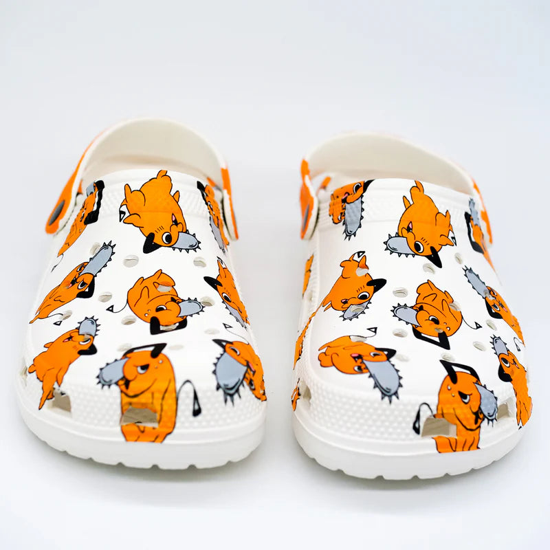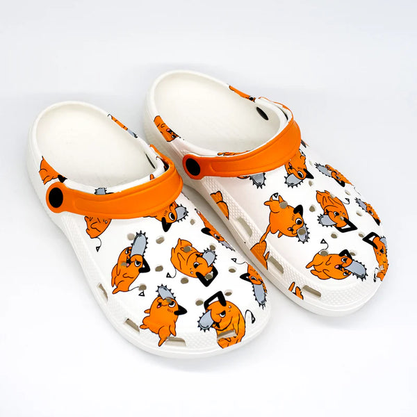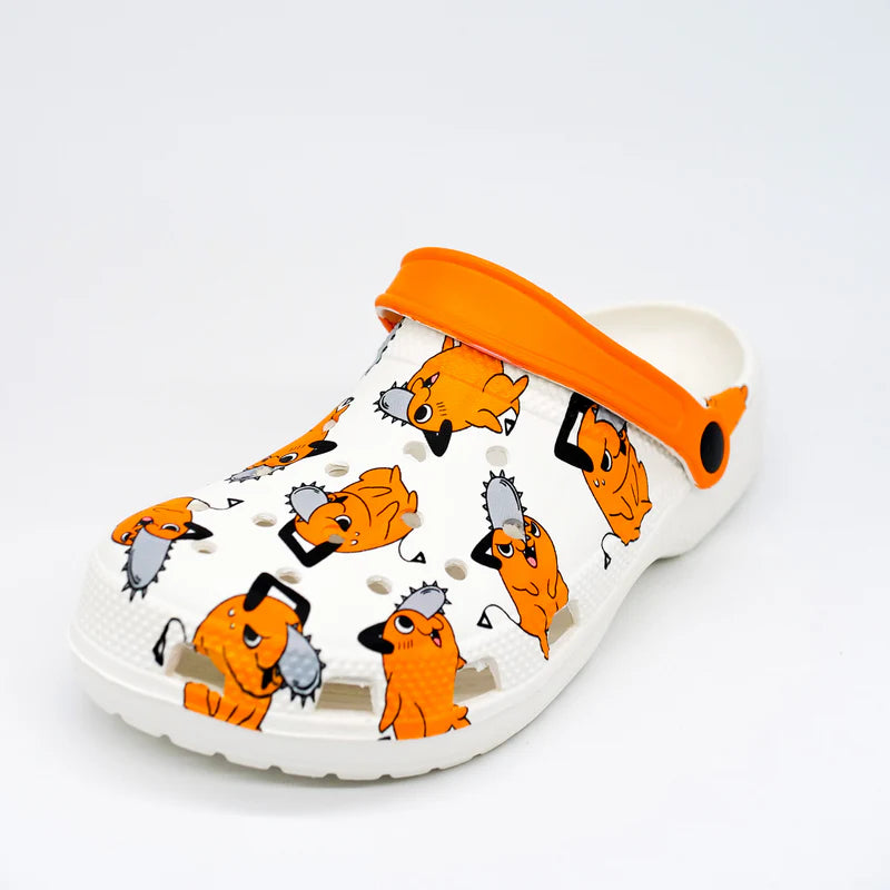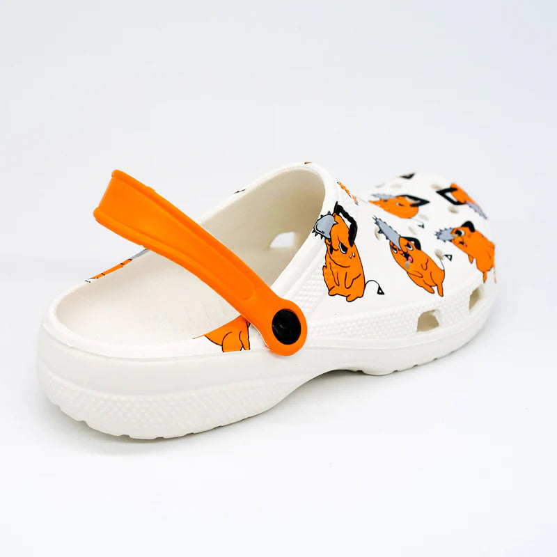 Pensés pour allier style otaku et confort du quotidien, ces sabots arborent un motif intégral de Pochita sur fond blanc, rehaussé d’une bride orange vive.