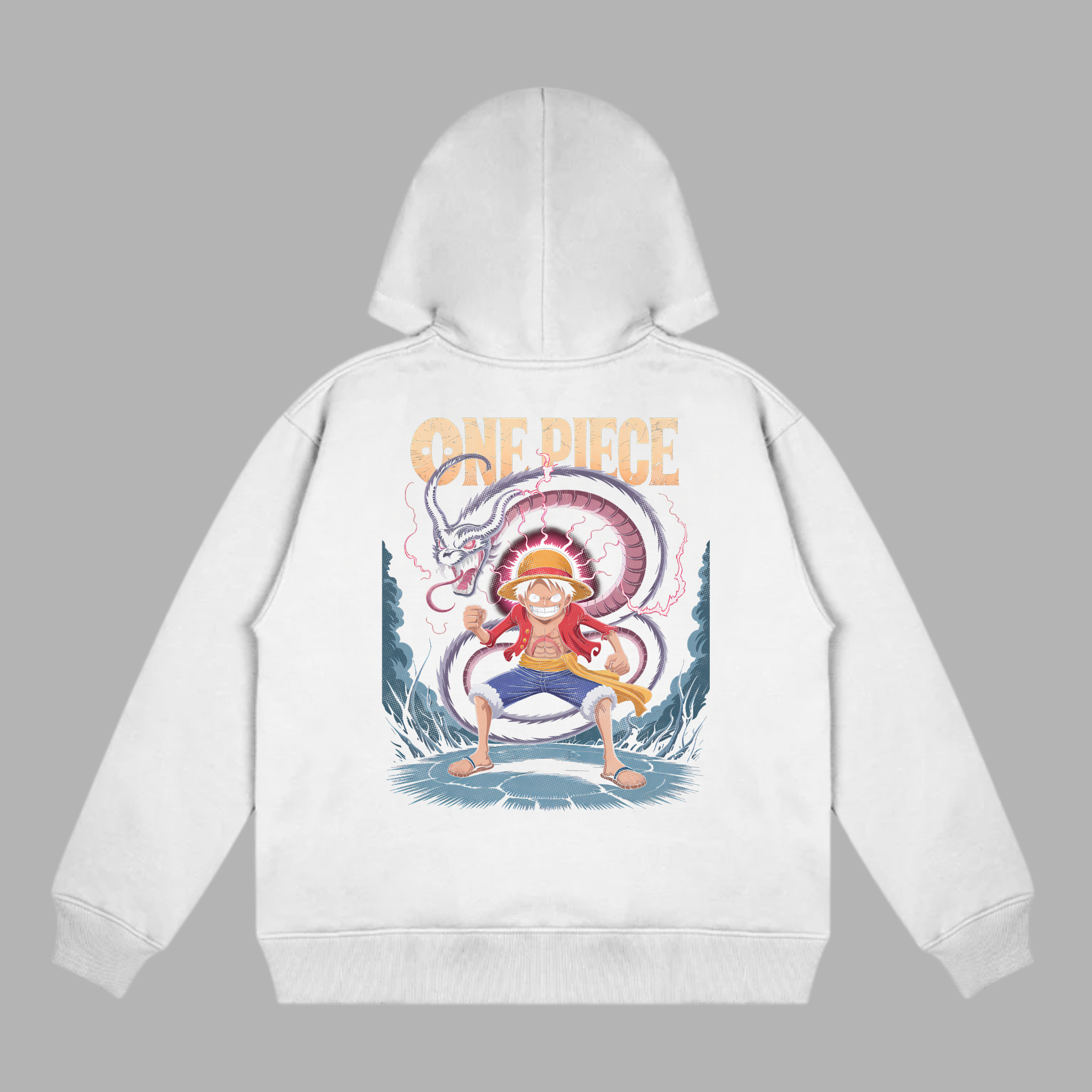 Flocage premium au dos : illustration détaillée de Luffy dans une pose puissante avec un dragon imposant, symbole de force et de détermination