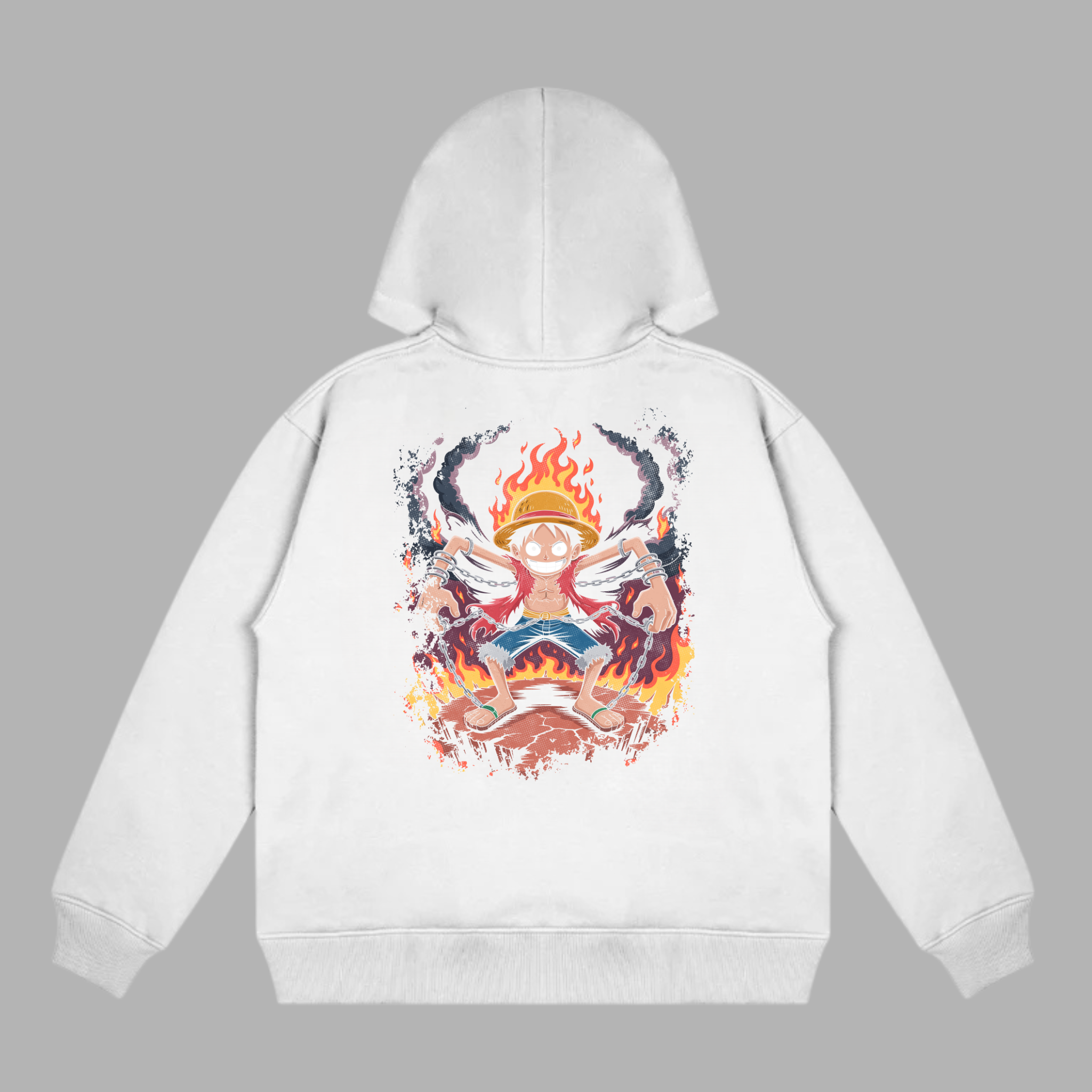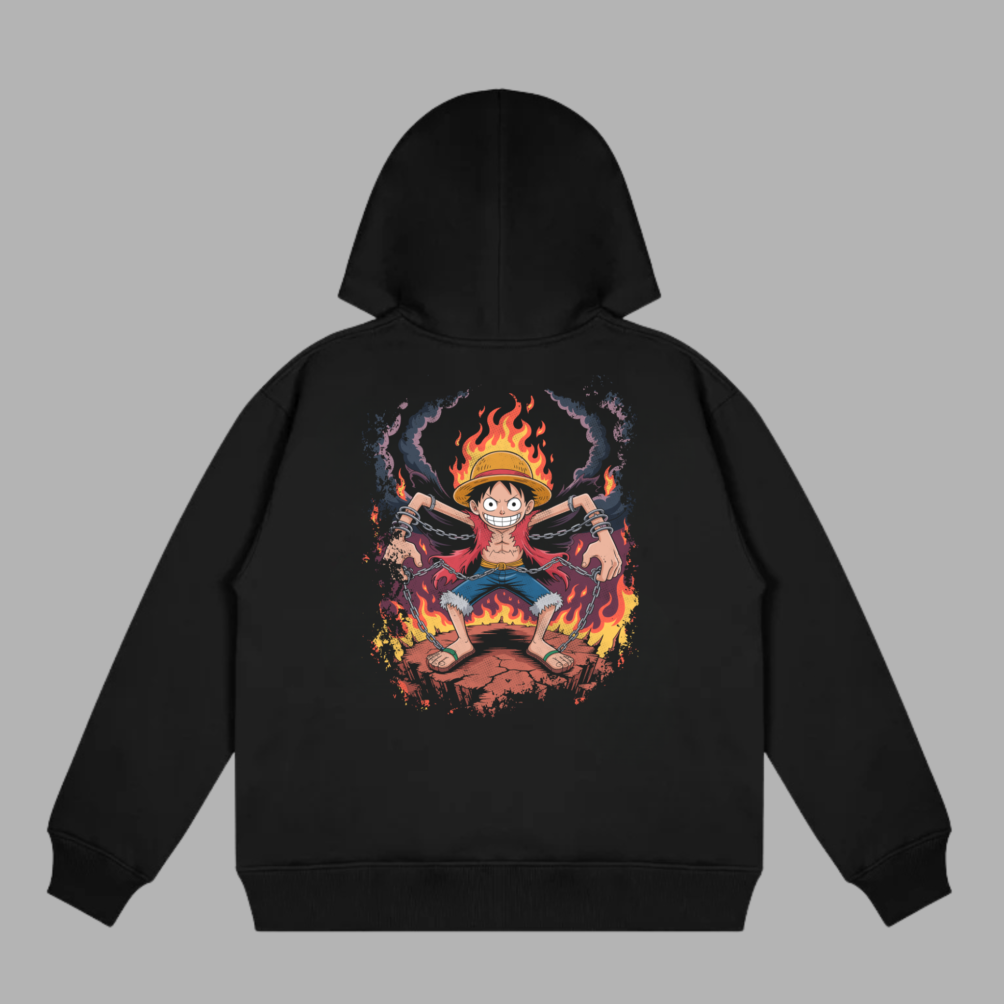Adopte un style intense avec le Sweat Luffy Enchaîné en Flammes : un vêtement confortable et puissant qui met en avant le futur Roi des Pirates emprisonné dans des chaînes incandescentes.