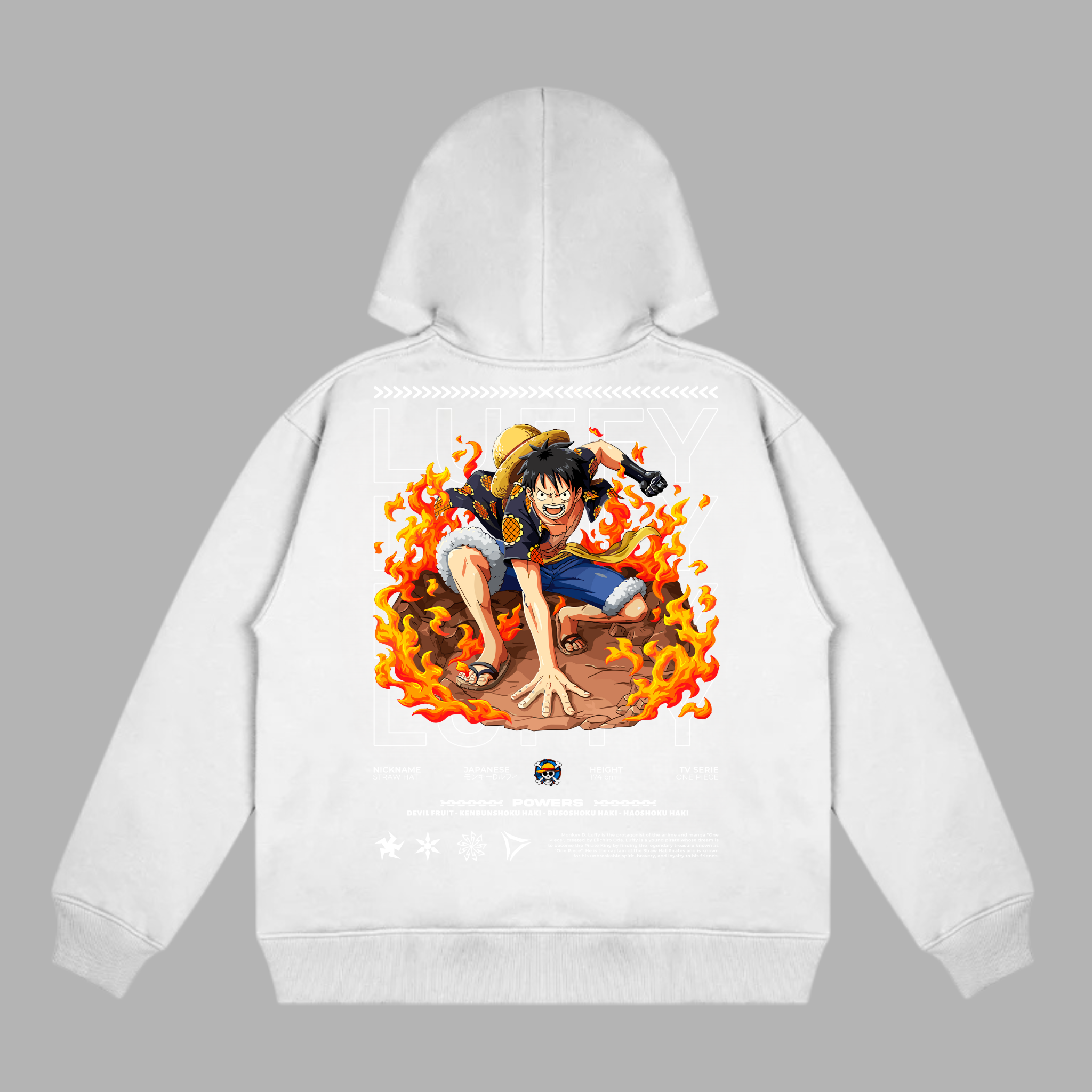 Flocage premium au dos : illustration détaillée de Luffy en position de combat, enveloppé de flammes ardentes et d’une énergie explosive
