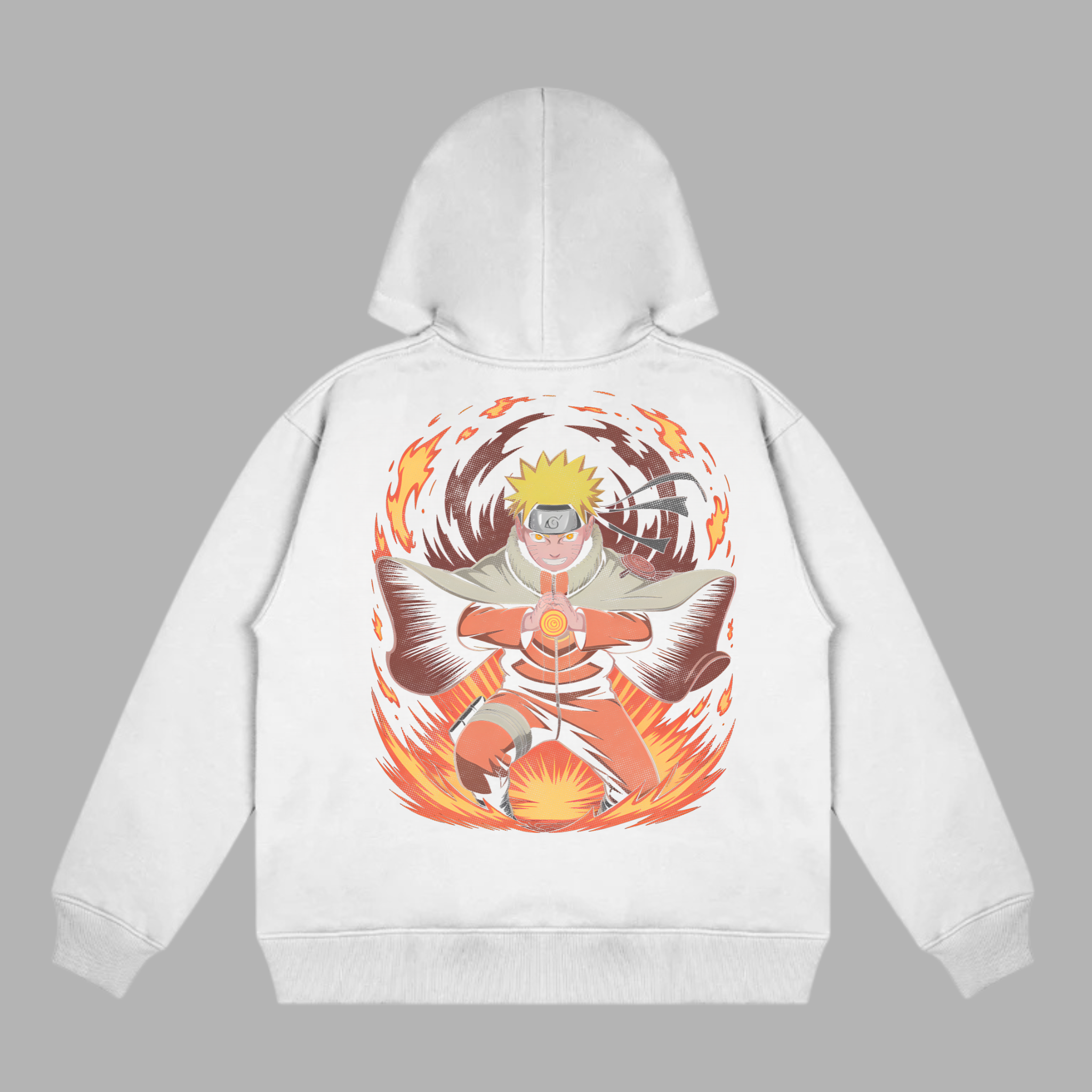 Flocage premium au dos : Naruto en mode chakra, rendu intense et fidèle.