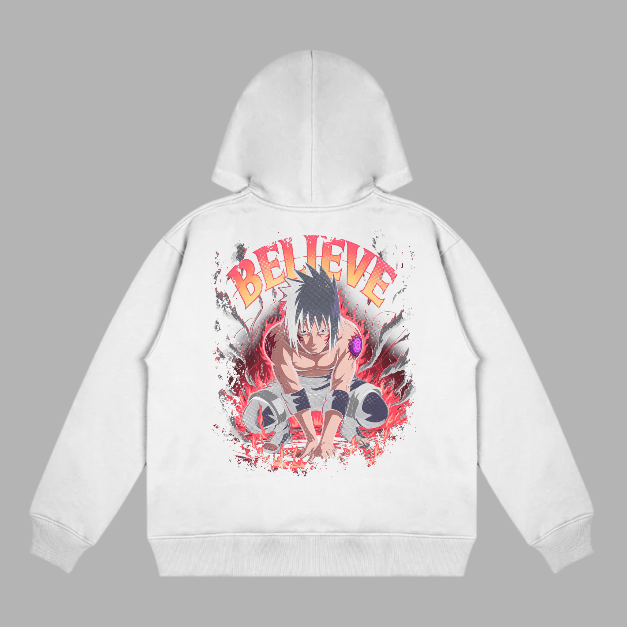 Sweat Sasuke Believe blanc avec design premium de Sasuke Naruto et aura flamboyante