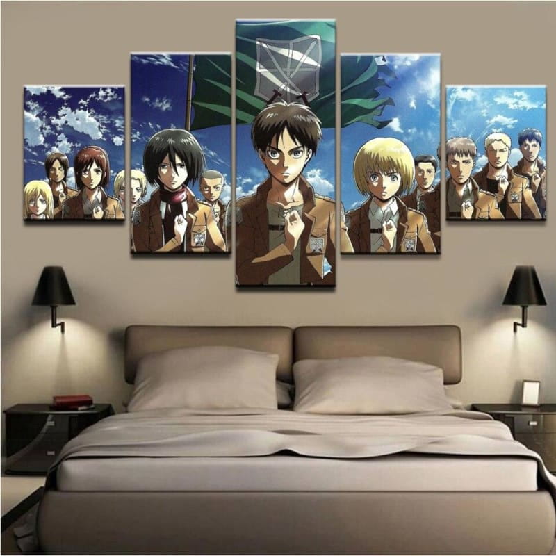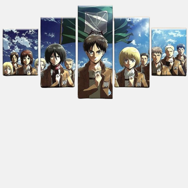 Design "La Charge des Dévoués" : L'œuvre rassemble les figures emblématiques du Bataillon. Le regard visionnaire d'Erwin, la détermination glaciale de Livaï, la curiosité passionnée de Hange, et le feu dans les yeux des jeunes recrues. Ils se tiennent unis, prêts pour leur prochaine expédition extra-muros. La composition en 5 panneaux donne une ampleur solennelle à ce rassemblement de héros.
