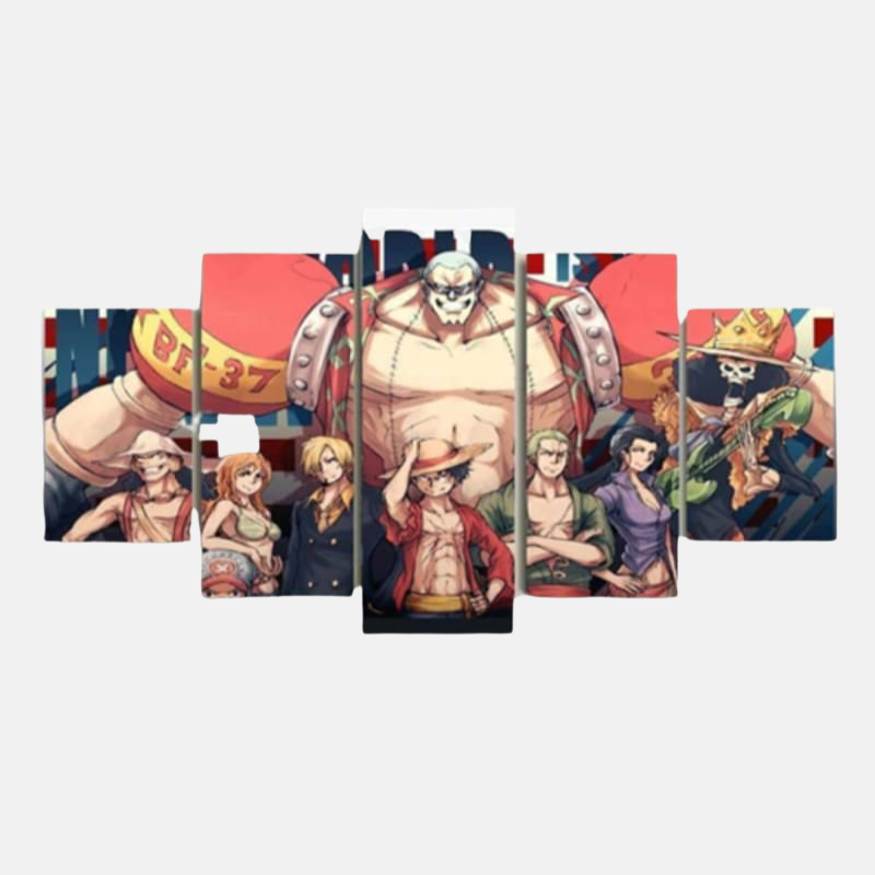 Design "L'Équipage du Yonko" : L'œuvre est un portrait de groupe puissant et solennel. Finies les poses insouciantes, place à la détermination. Chaque membre, dans sa tenue post-ellipse, affiche une confiance et une puissance qui forcent le respect. La composition en 5 panneaux offre une vision d'ensemble digne d'une flotte impériale.